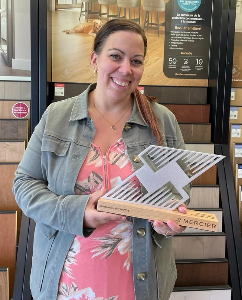 Territory Manager for the Greater Montreal area, expresses her pride in Alexandra winning this award: "For several years, Alexandra has consolidated her expertise and deepened her knowledge of Mercier flooring through various training activities, factory visits, and a constant curiosity for learning. She has acquired knowledge that enhances the reputation of the Mercier brand among her clients and colleagues. She is the kind of Ambassador Mercier needs to unite people around our brand."