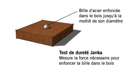 Le test de dureté Janka est, entre autres, un outil de comparaison permettant de qualifier la résistance aux indentations de différentes essences. Plus une essence est dense, plus son résultat aux essais Janka sera élevé. Pour les curieux de nature, le Janka mesure la force (mesurée en livre de force) nécessaire pour enfoncer dans le bois, jusqu’à la moitié de son diamètre, une bille d’acier de 11,284 mm (0,444 po).