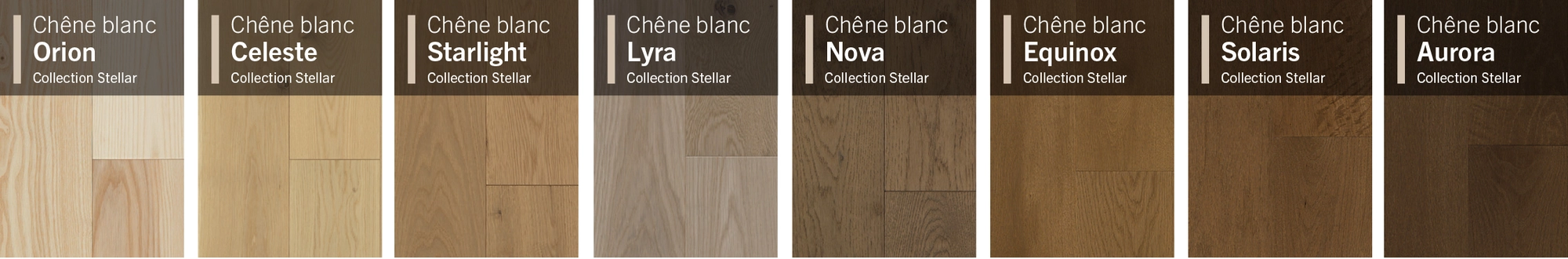 La nouvelle Collection Stellar met en lumière le charme européen du Chêne blanc agencé aux plus belles teintes et à la réputée finition Mercier. Celle-ci est composée de 8 couleurs neutres et intemporelles allant du blanc délavé au brun soutenu.